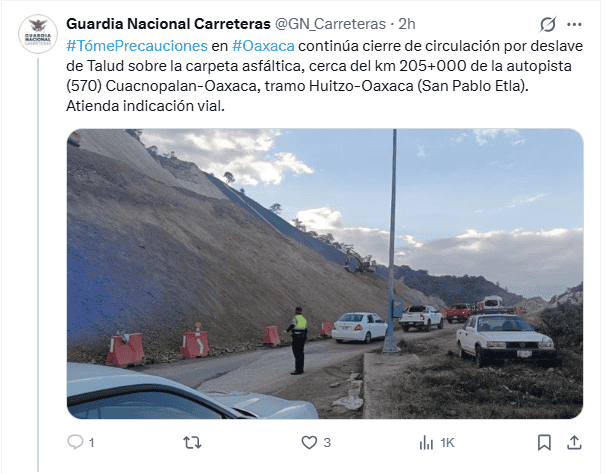 - In Oaxaca, there is a partial closure of circulation due to a road accident after the conclusion of maneuvers, near km 037+200 of the highway Oaxaca-Puerto Ángel.