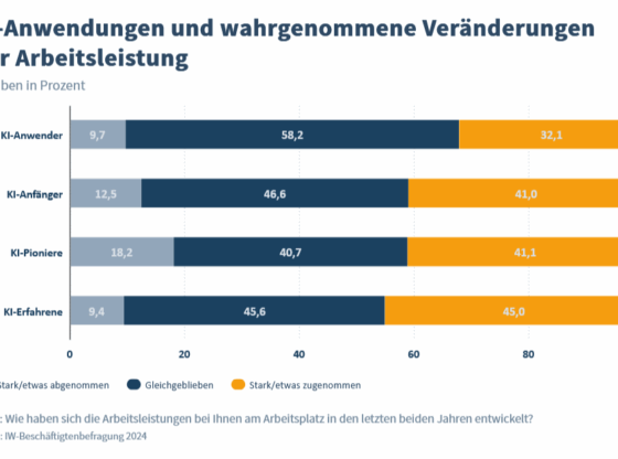 Around 40 percent of companies that already use AI in some areas report increased work productivity through this technology. Employees notice changes and the reviews are mostly positive, but not always: around 15 percent of users of new AI technologies report a decline in their work performance (see the graphic from the German Economic Institute).