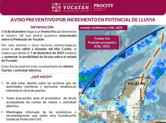 He pointed out that the frontal system, combined with other meteorological factors, such as the warm, humid air from the Caribbean Seawill cause the probability of rain over Yucatán to increase from Sunday, December 7.