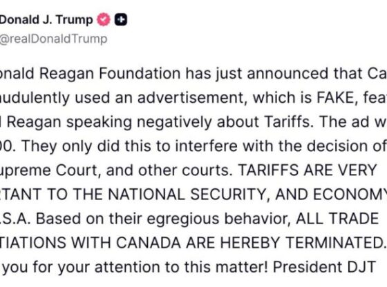The broadcast of the television advertisement on October 23 angered Trump, who took to his platform, Truth Social, to denounce that “due to his atrocious behavior, ALL TRADE NEGOTIATIONS WITH CANADA ARE SUSPENDED.”