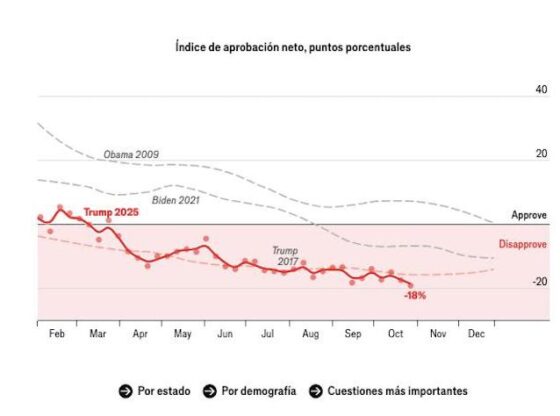 Mexico City, October 30 (However).– The Donald Trump’s popularity has fallen on a slide in his second term. The American President barely has the support of the 44.9 percent of the Americans against 52.1 percent disapproval, a difference of 7.2 points, the largest since he returned to the White House last January, according to RealClearPolitics’ weighted polls.