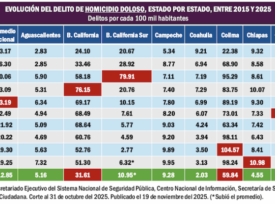 The national average of intentional homicides per 100 thousand inhabitants, until the end of October 31, 2025, is 12.85 murders. States such as Baja California, Colima, Guanajuato, Guerrero, Morelos, Oaxaca, Sinaloa, Sonora and Tabasco exceed this national average.