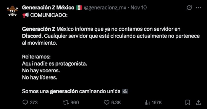On November 10, the X account “Generation Z Mexico” reported that the movement no longer had any group on Discord. “Any server that is circulating does not belong to this movement,” he published on