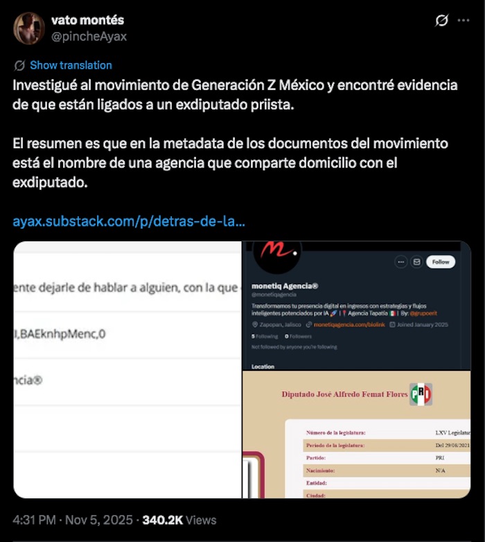 The user from a PRI family who sneaked in, he said, was expelled. But by then the X (formerly Twitter) user, Vato Montés, had already revealed it. On the social networks of “Generation Z Mexico” they were invited to join the Discord group, where they published the manifesto in pdf format, whose metadata showed that was created by Monetiq, an agency that helps monetize far-right media, which shares tax domicile with the former deputy of the PRI, José Alfredo Femat Flores.