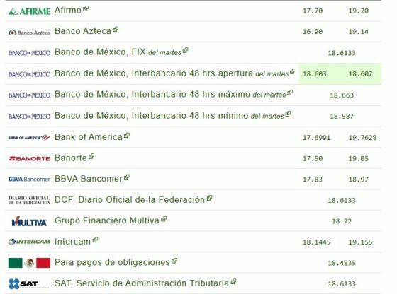 When purchasing, the lowest price is 16.90 pesos per dollar offered by Banco Azteca, and the highest is: 18.3418 pesos per dollar offered by Banco BX+.