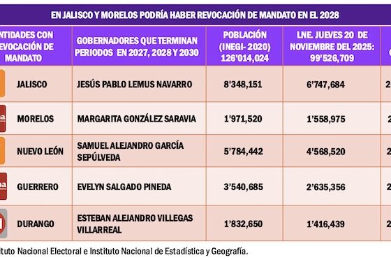 Of the 16 entities in the country where the Revocation of Mandate is regulated, Jalisco and Morelos could face this exercise in 2028. Both states have administrations marked by inefficiency, negligence and suspicions of corruption, first with Enrique Alfaro in Jalisco and Cuauhtémoc Blanco in Morelos, and their current rulers, Pablo Lemus Navarro (MC) and Margarita González Saravia (Morena), could be put to the polls if the problems inherited ones become worse and their own faults are added.