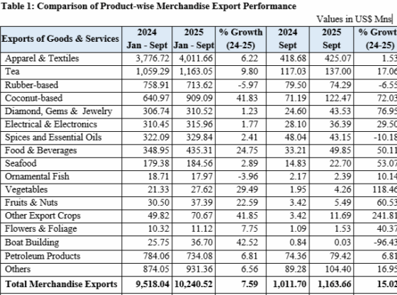 ECONOMYNEXT – Sri Lanka’s merchandise exports rose 15.02 percent to 1,163.66 million dollars in September 2025 from a year ago, helped by tea, coconut and apparel exports, data from the export promotion office showed.