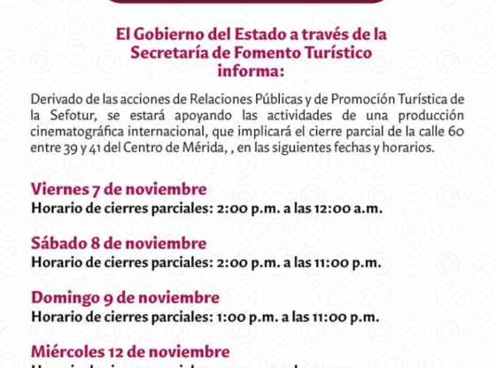 According to government authorities, the recordings will be carried out in the 60th street, between 39 and 41 of the historic center of Merida on the following dates and times: