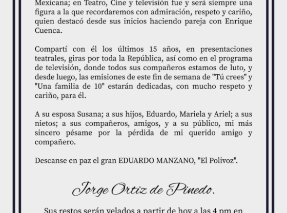 “Today, Friday, December 5, at one minute in the morning, our beloved Eduardo Manzano ceased to exist, the unforgettable Polivoz, who with his grace, talent and sympathy, made us laugh with his masterful imitations and with the creation of unforgettable characters, like the one he played in the last years of his life: Don Arnoldo López Conejo, the grandfather of ‘A Family of Ten’.”