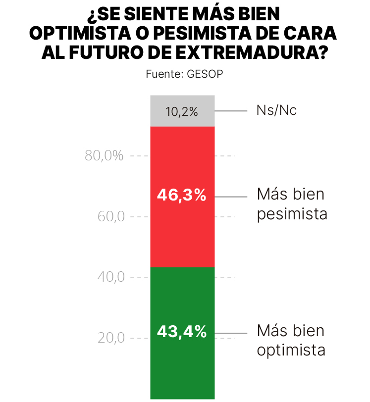 Este contraste se refleja también en la percepción del futuro. El 46,3% de los extremeños se muestra “más bien pesimista” respecto a la evolución de la comunidad, frente a un 43,4% “más bien optimista”. La diferencia es ajustada, pero suficiente para indicar un clima de incertidumbre que atraviesa a la mayoría de los segmentos sociales, con especial intensidad entre mujeres, personas de mediana edad y población con estudios superiores.