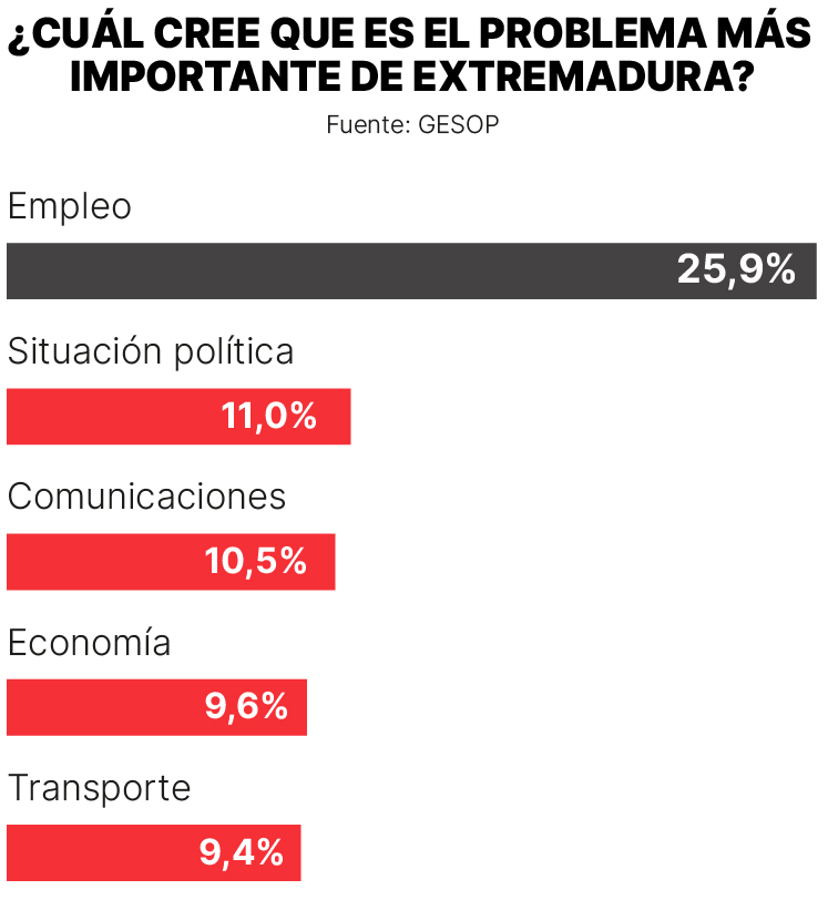 El empleo se sitúa, con diferencia, como el principal problema de Extremadura. Un 25,9% de los encuestados lo menciona en primer lugar, muy por encima del resto. Esta preocupación está estrechamente ligada a la falta de oportunidades, especialmente entre los jóvenes, y ayuda a explicar tanto el pesimismo social como el desplazamiento de parte del electorado más joven hacia opciones de derechas, en busca de respuestas disruptivas a una situación percibida como estancada.