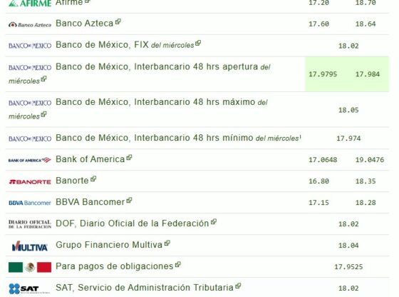 When purchasing, the lowest price is 16.80 pesos per dollar offered by Banorte bank, and the highest is: 17.4717 pesos per dollar offered by BX+ bank.